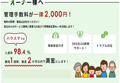 1室2,000円・1棟丸ごとですと1室1000円の管理プランが大変好評をいただいており、管理をお任せいただいている家主様からの紹介が多く創業から5年で管理・専任物件が400戸を達成いたしました。