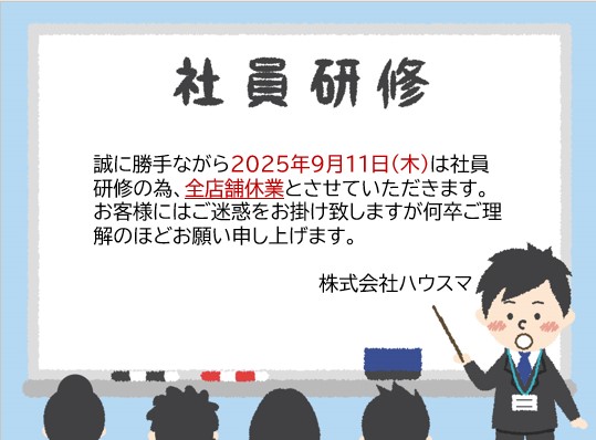 「2025年9月11日(木)は社員研修の為、休業とさせていただきます」2025-09-09
