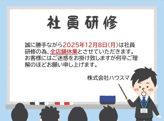 「2025年12月8日(月)は社員研修の為、休業とさせていただきます」2025-12-04