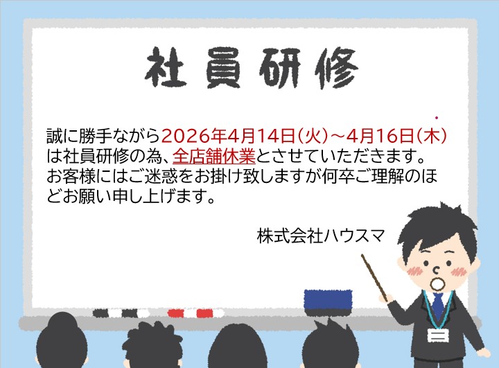 「2026年4月14日(火)~4月16日(木)の間、社員研修の為、休業とさせていただきます」2026-04-06