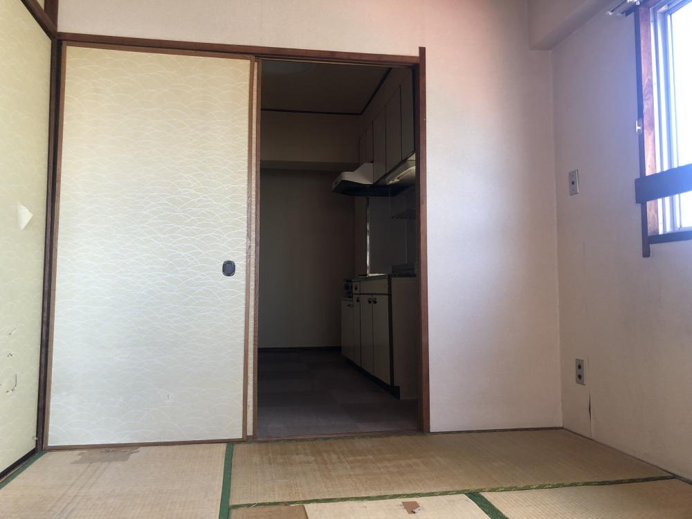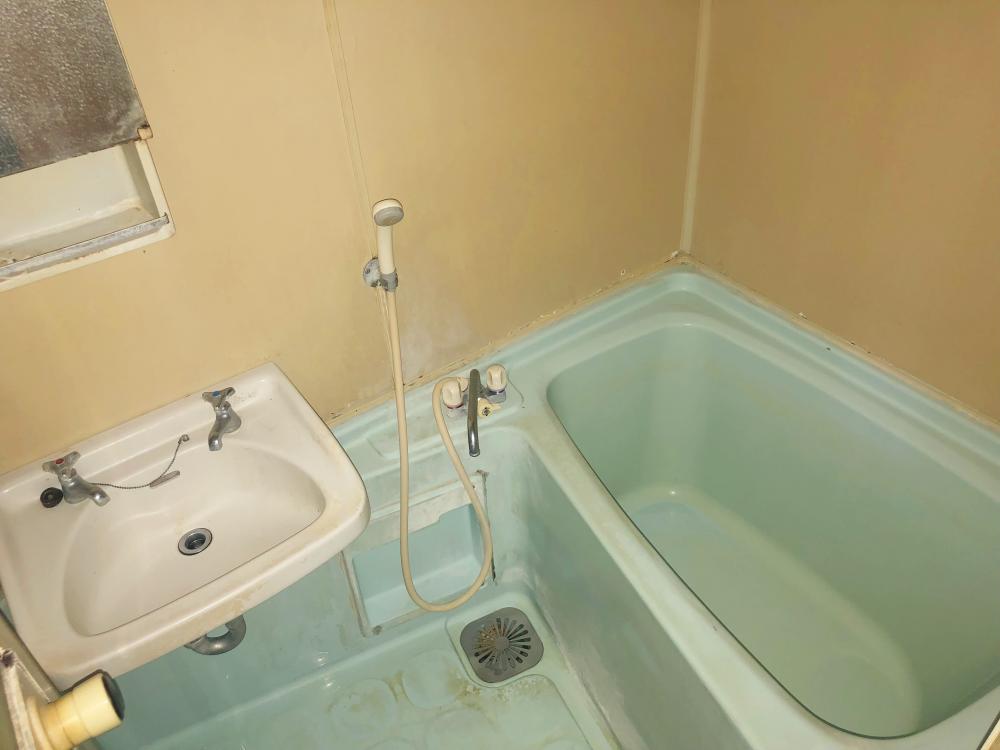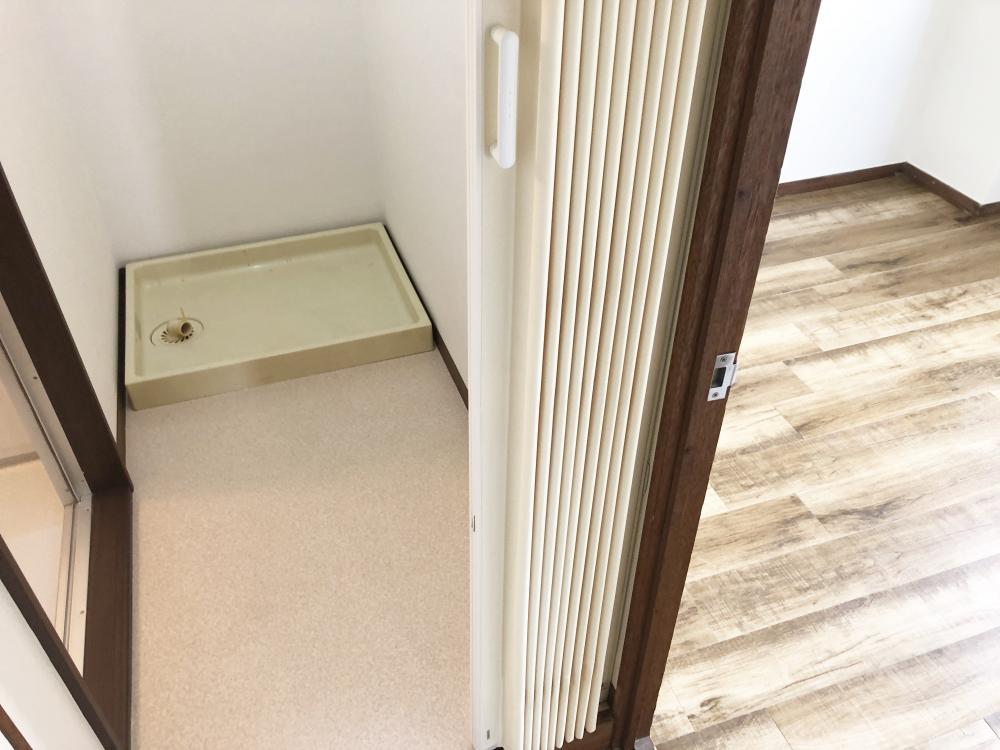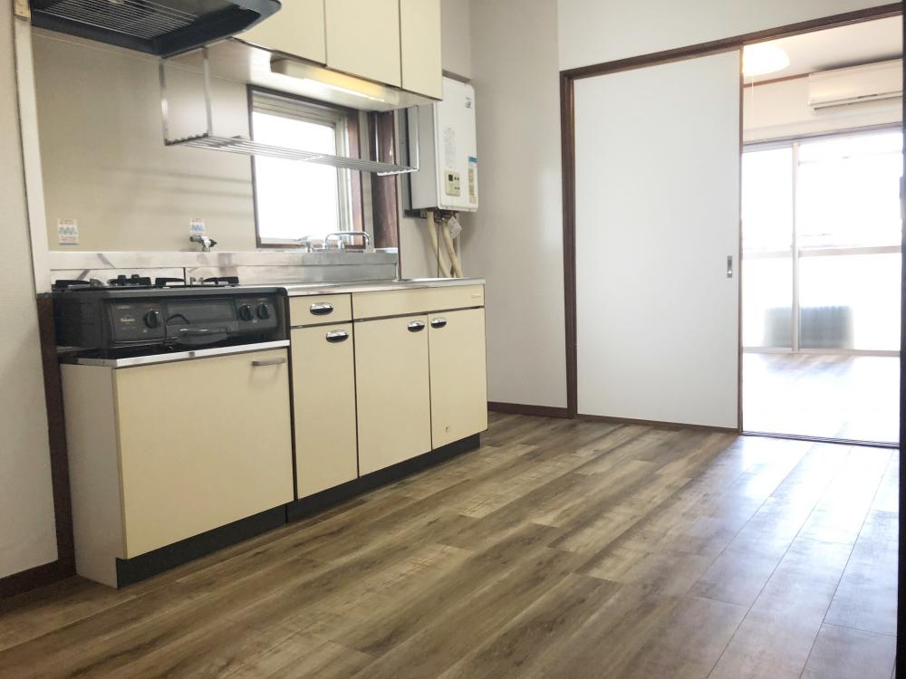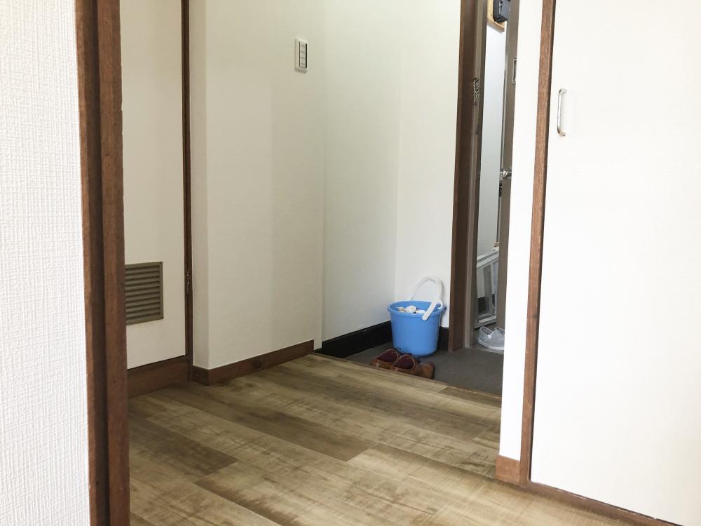 明るめのおしゃれな床材で「DK」「居室2部屋」「廊下」「玄関」を張替え、全室の「壁紙交換」、「浴室の交換」を行いました。