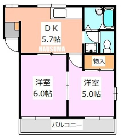 築年月 1991年6月  間取り 2DK( DK5.7畳/洋室6畳/洋室5畳 ) 専有面積 36.33m2