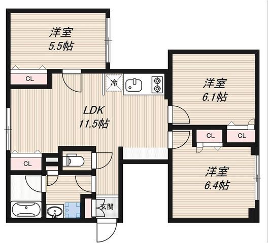 | 築年月 | 2019年12月 | 間取り | 3LDK( LDK11.5畳/洋室6.4畳/洋室6.1畳/洋室5.5畳 ) | 専有面積 | 62.27m2 |