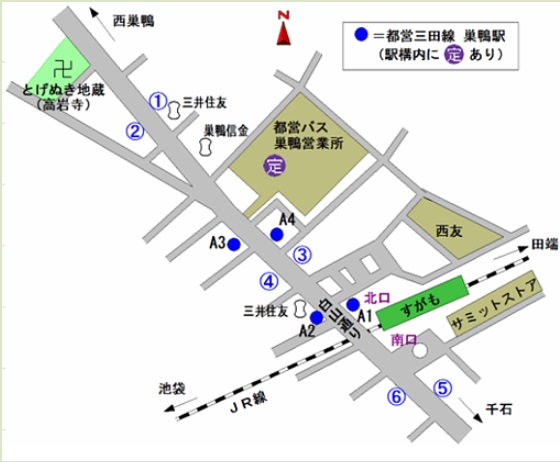 センター」方面A2番 「地蔵通り商店街」「ソフトバンク巣鴨店」「ドコモショップ巣鴨駅前店」方面 A3番 「地蔵通り商店街」「マクドナルド」「高岩寺」「ときわ食堂本店」方面 A4番 「すしざんまい」「アパホテル巣鴨駅前」「東京中央卸売市場豊島市場」方面