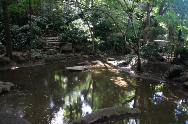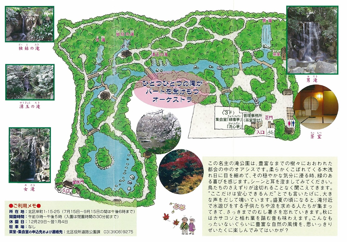 名主の滝公園(なぬしのたきこうえん)は東京都北区岸町一丁目にある区立公園です。江戸時代に王子村の名主、畑野孫六が屋敷内に滝を開き、茶を栽培して避暑のために一般に公開したのが始まりで、名前の「名主」はそこに由来します。園内は回遊式に庭園となっており、男滝(おだき)、女滝(めだき)、独鈷の滝(どっこのたき)、湧玉の滝(ゆうぎょくのたき)の4つの滝が復元されている。
