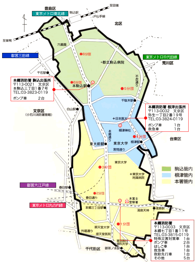 本郷消防署は、文京区の東半分を管轄し、区の面積の42パーセントを占めています。