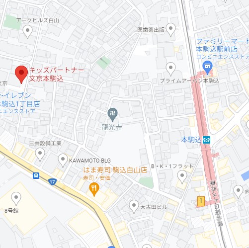 名称 キッズパートナー文京本駒込 所在地 東京都文京区本駒込1丁目11−15 最寄り駅 東京メトロ南北線「本駒込駅」徒歩5分 駐車場 なし 電話 03-5810-1635 開園時間