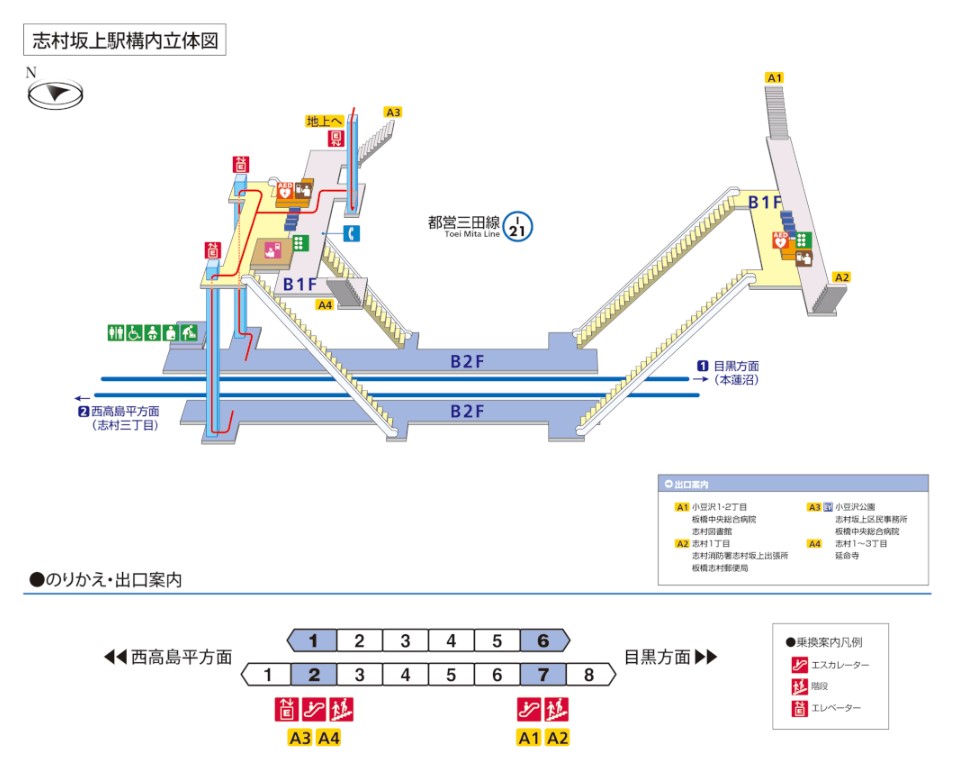 A1出口 小豆沢1・2丁目、板橋中央総合病院方面 A2出口 志村1丁目、志村一里塚方面 A3出口