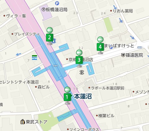 「東武ストア 本蓮沼駅前店」「まいばすけっと本蓮沼駅前店」「肉のハナマサ板橋志村店」「オーケー板橋大原店」「ダイソー本蓮沼駅前店」「ライフ前野町店」「コモディイイダ宮本町店」「まいばすけっと志村1丁目店」など