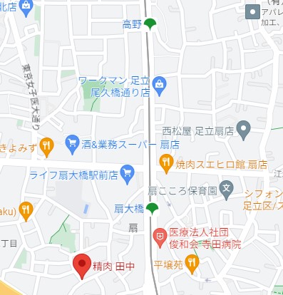 ◆詳細情報名称 精肉 田中 所在地 東京都足立区江北1-21-13 最寄り駅 日暮里舎人ライナー「高野駅」徒歩10分 電話 03-3896-4684 営業時間