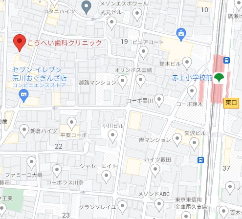 名称 こうへい歯科クリニック 所在地 東京都荒川区東尾久4-16-7 最寄り駅 日暮里舎人ライナー「赤土小学校前駅」徒歩3分 電話 03-3893-2519 営業時間